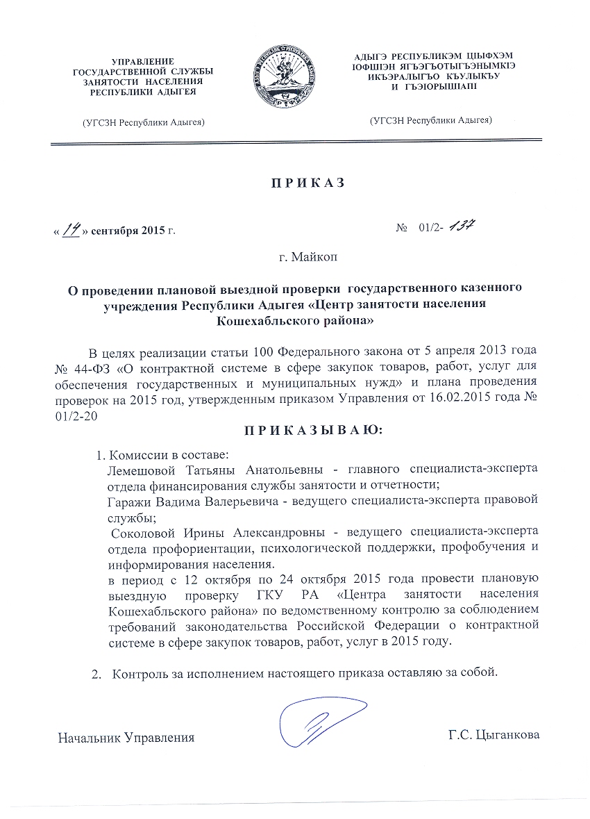 Приказ УГСЗН Республики Адыгея от 14.09.2015 №01/2-137 "О проведении плановой проверки государственного казенного учреждения Республики Адыгея "Центр занятости населения Кошехабльского района"