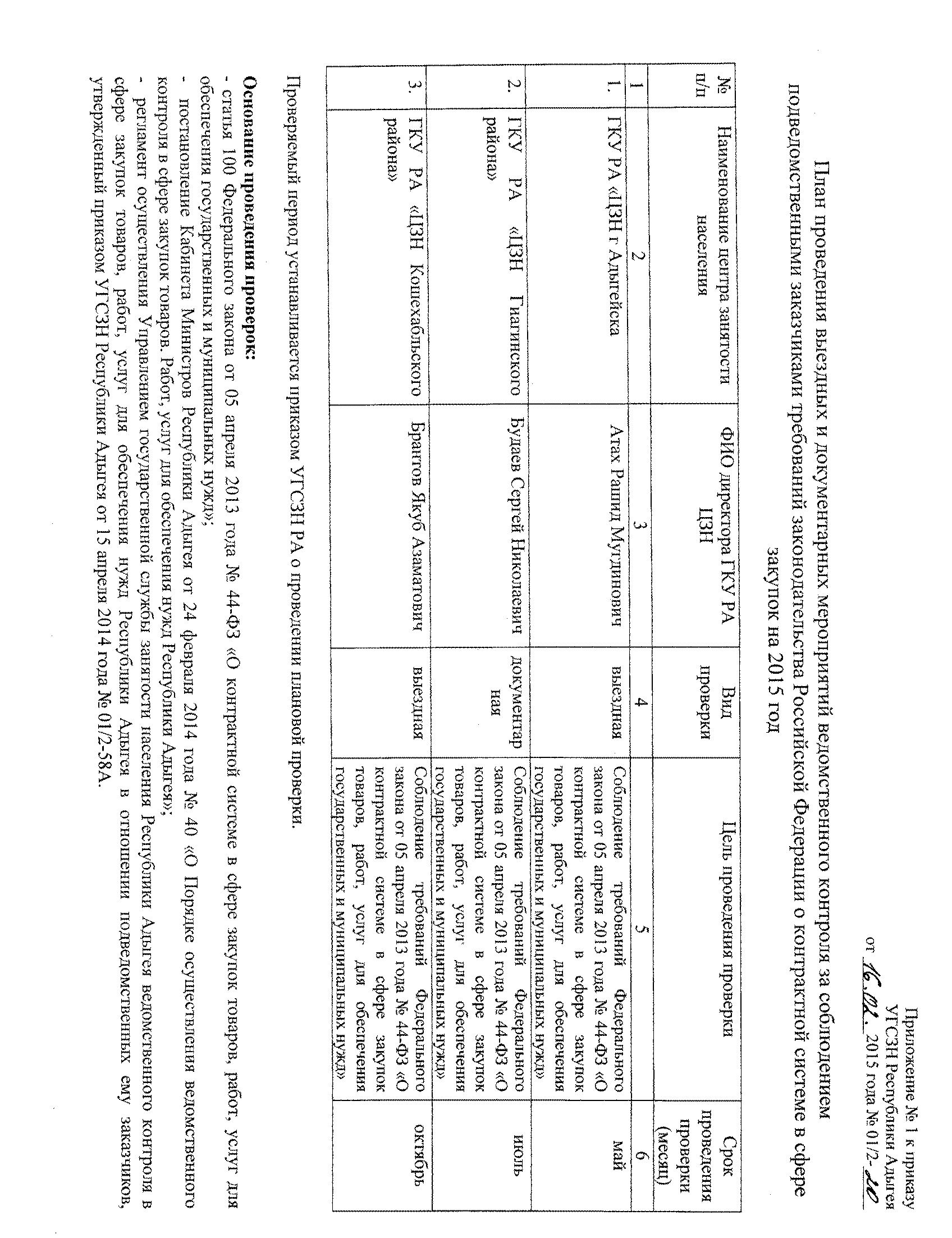 Приложение к приказу УГСЗН Республики Адыгея от 16.02.2015 г. "О ведомственном контроле в свере закупок, работ, услуг государственных казенных учреждений РА центров занятости населения на 2015 год."