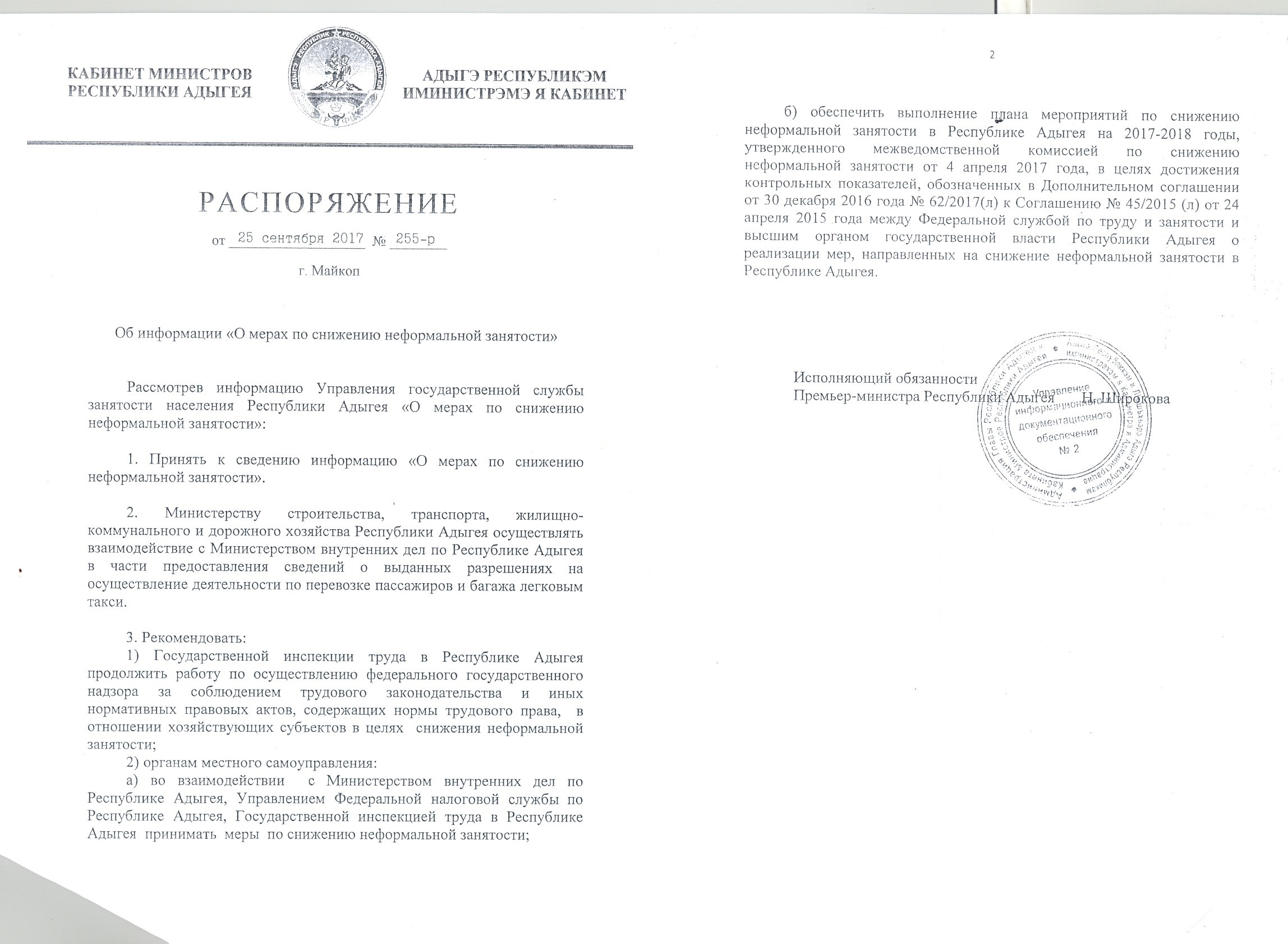Распоряжение Кабинета Министров РА от 25 сентября №255-р об информации "О мерах по снижению неформальной занятости"