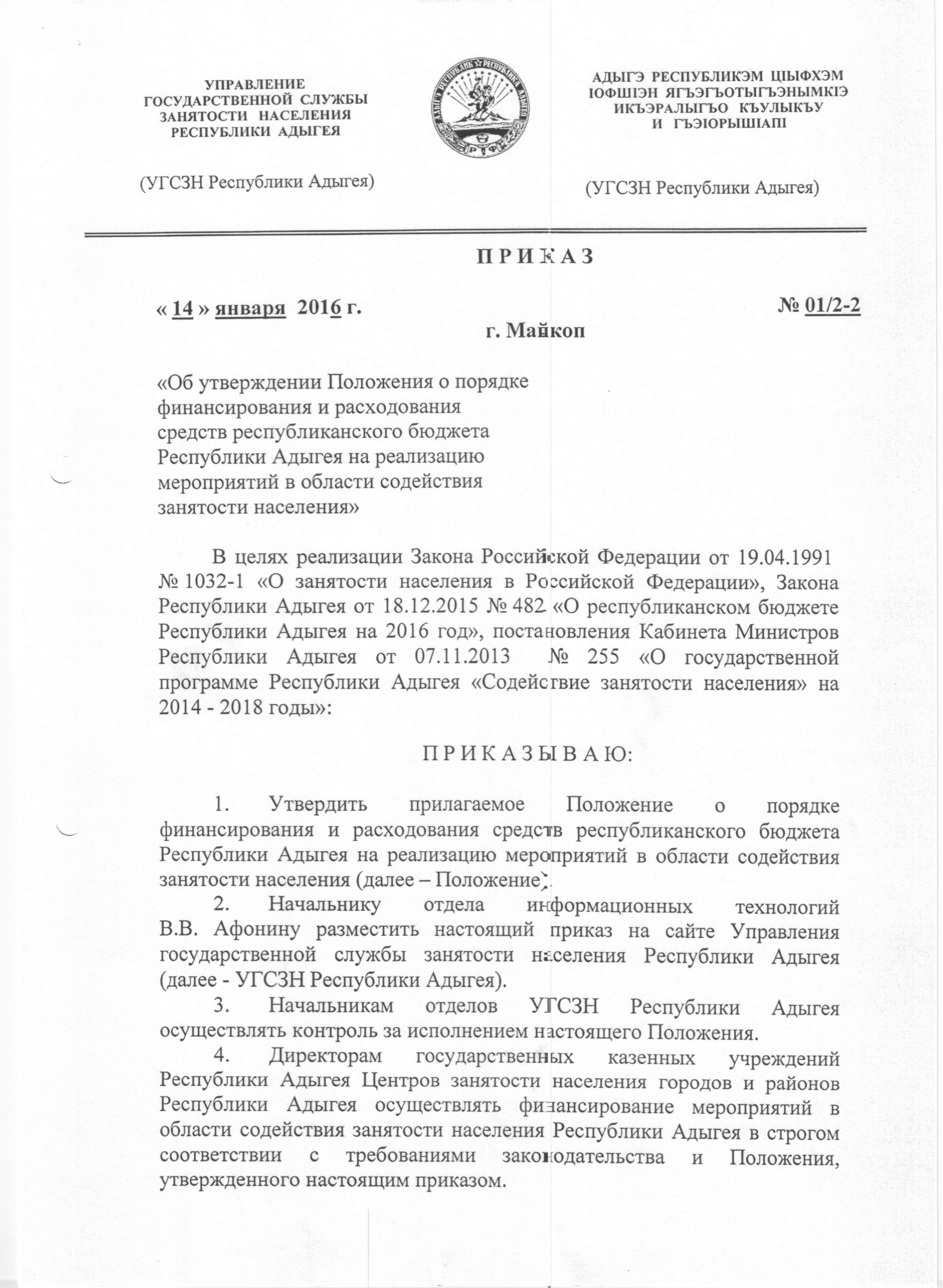 Положение о порядке финансирования и расходования средств республиканского бюджета Республики Адыгея на реализацию мероприятий в области содействия занятости населения